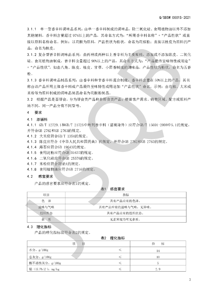Q/SBSW 0001S-2021 香辛料调味品及其制品系列