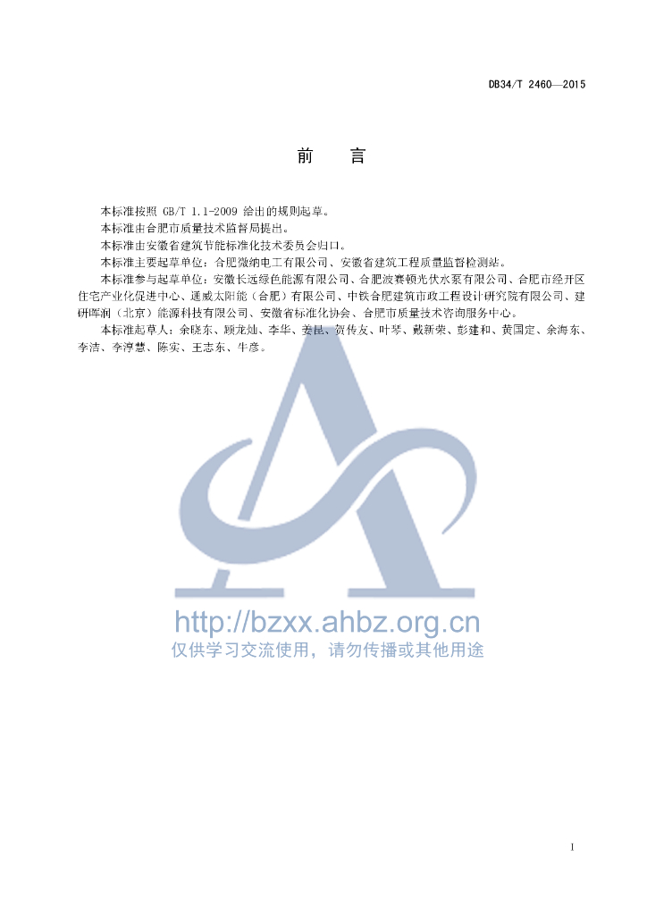 合肥微纳电工有限公司、安徽省建筑工程质量监督检测站。本标准参与起草单位:安徽长远绿色能源有限公司、合肥波赛顿光伏水泵有限公司、合肥市经开区住宅产业化促进中心、通威太阳能(合肥)有限公司、中铁