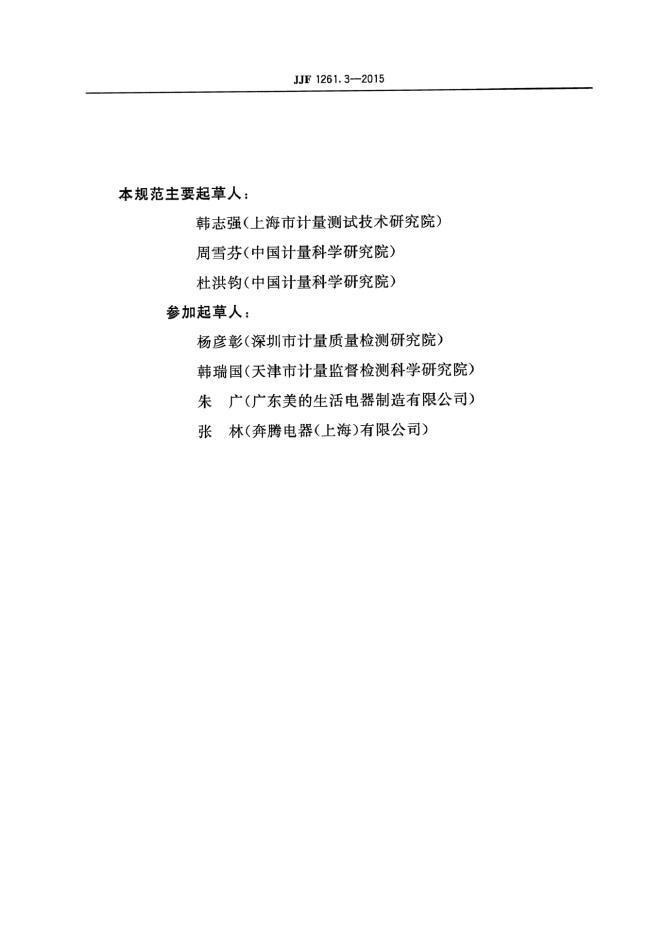 韩志强(上海市计量测试技术研究院)、周雪芬(中国计量科学研究院)、杜洪钧(中国计量科学研究院)、杨彦彰(深圳市计量质量检测研究院)、韩瑞国(天津市计量监督检测科学研究院)、朱广(广东美的生活电器制造有限公司)、张林(奔腾电器(上海)有限公司)