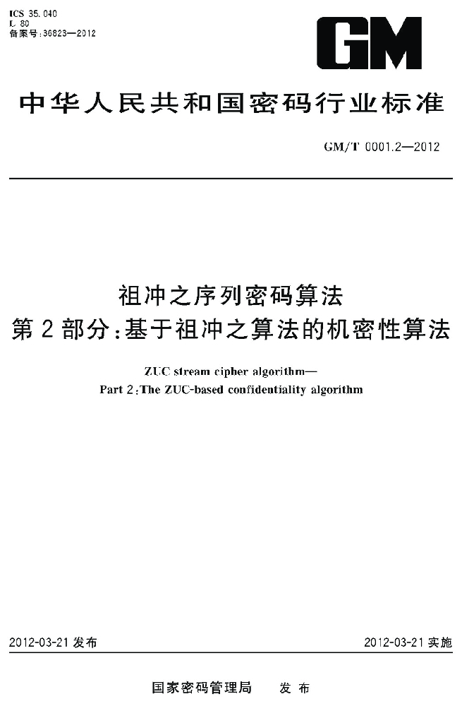 GM/T 0001.2-2012 祖冲之序列密码算法 第2部分:基于祖冲之算法的机密性算法