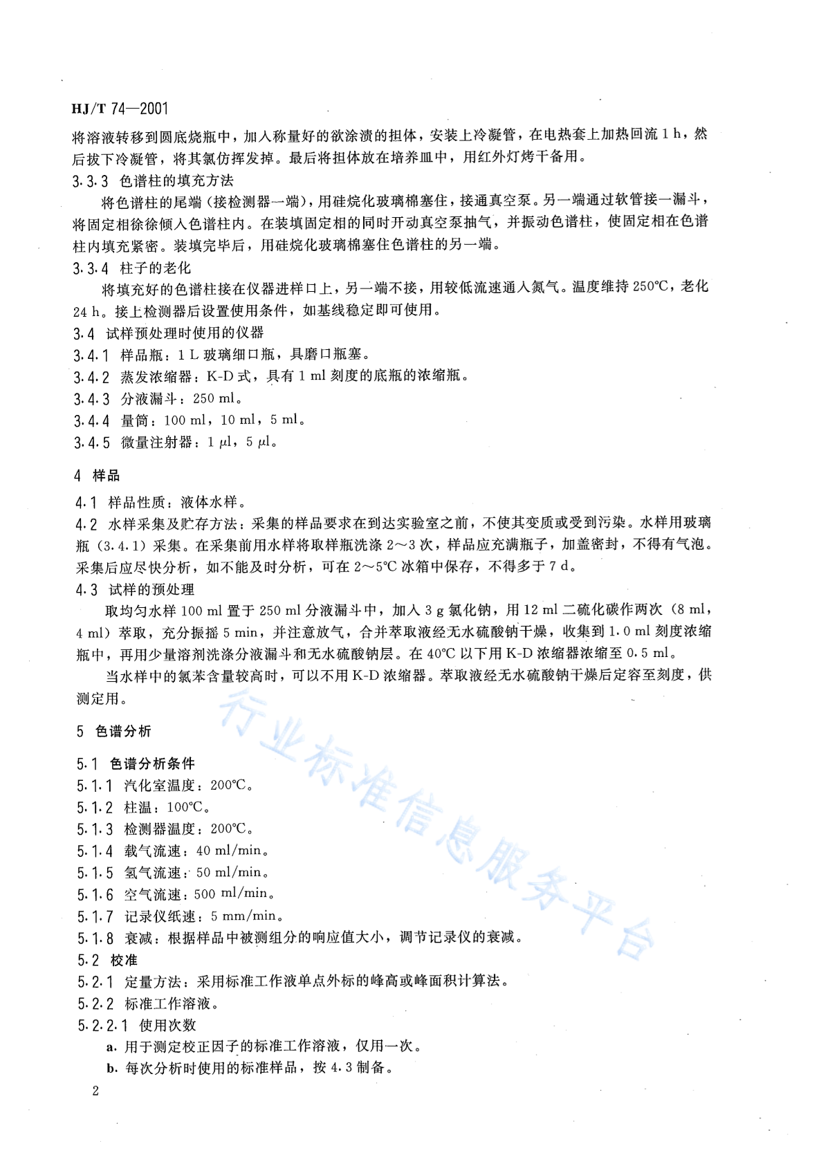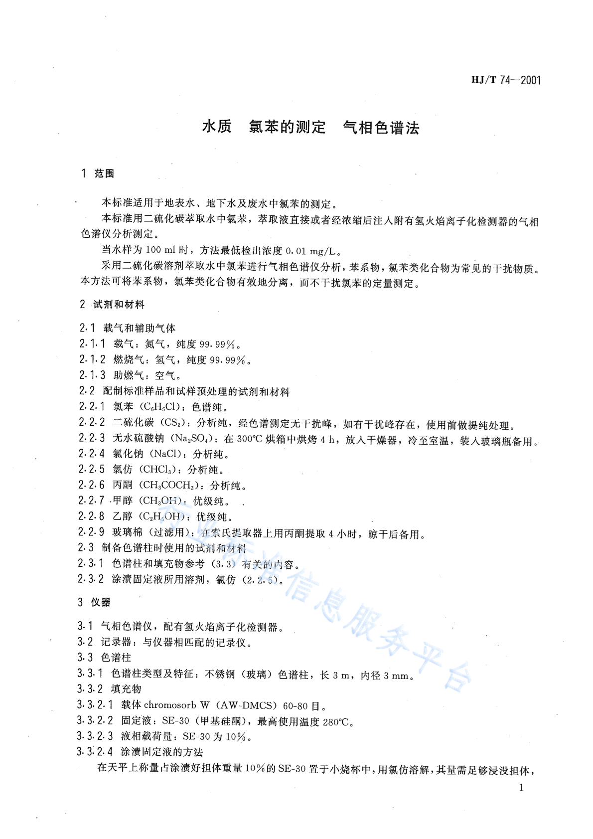 HJ/T 74-2001 水质 氯苯的测定 气相色谱法