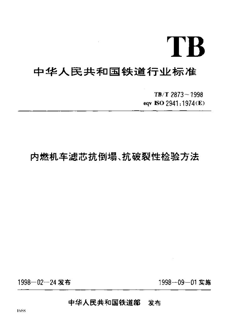 TB/T 2873-1998 内燃机车滤芯抗倒塌、抗破裂性检验方法