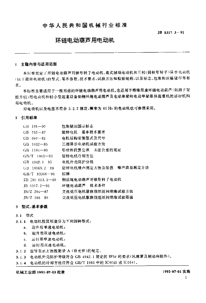 JB/T 5317.3-1991 环链电动葫芦用电动机