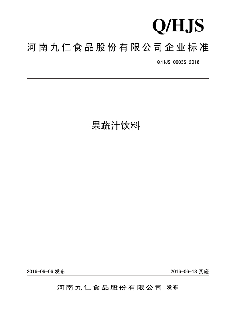Q/HJS 0003S-2016 河南九仁食品股份有限公司 果蔬汁饮料