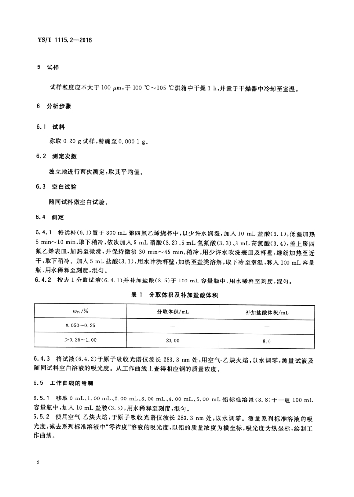 YS/T 1115.2-2016 铜原矿和尾矿化学分析方法 第2部分:铅量的测定火焰原子吸收光谱法