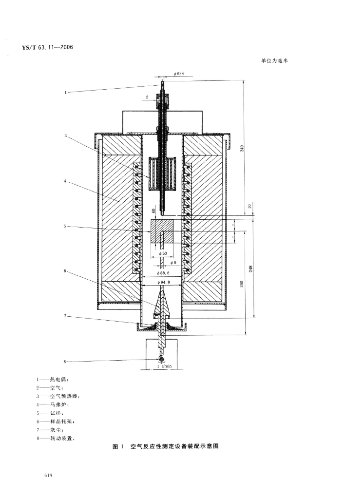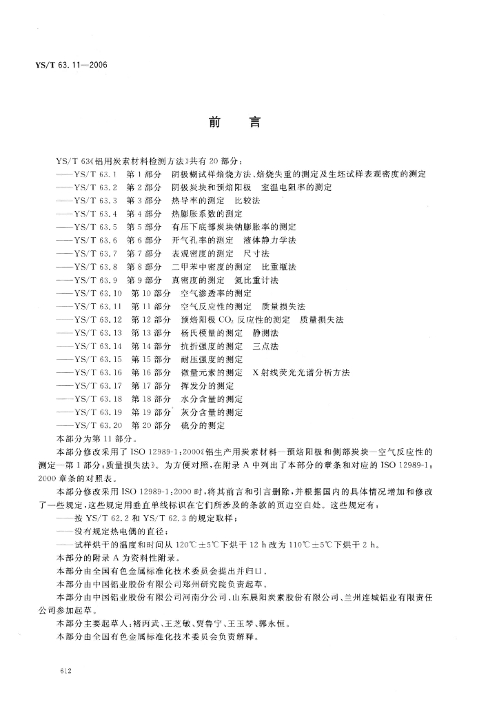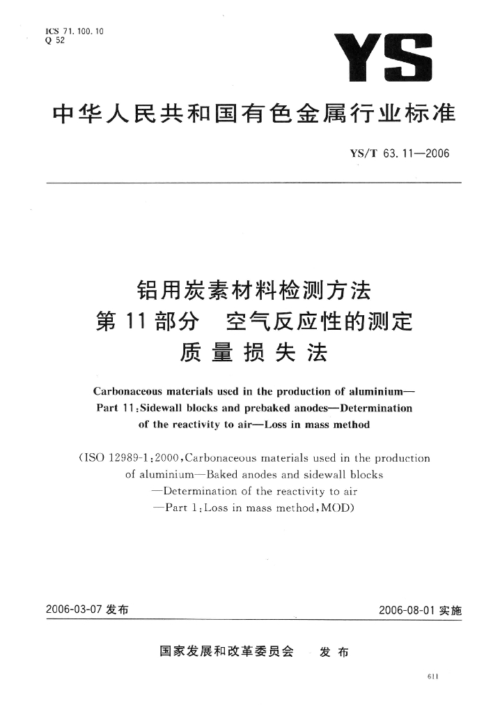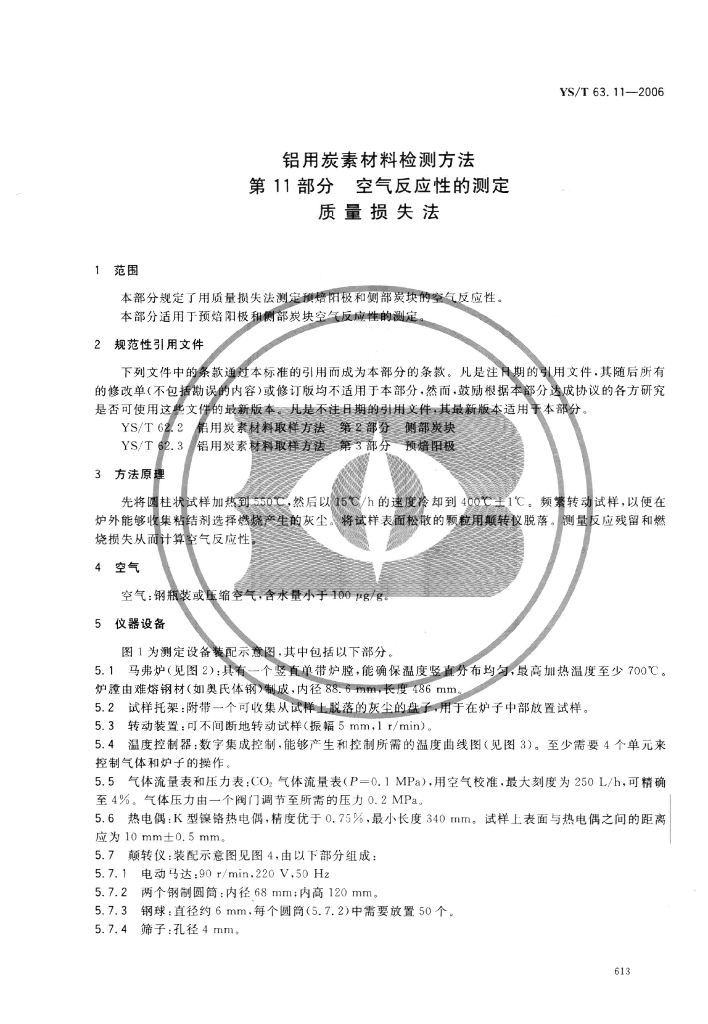 YS/T 63.11-2006 铝用炭素材料检测方法 第11部分:空气反应性的测定 质量损失法