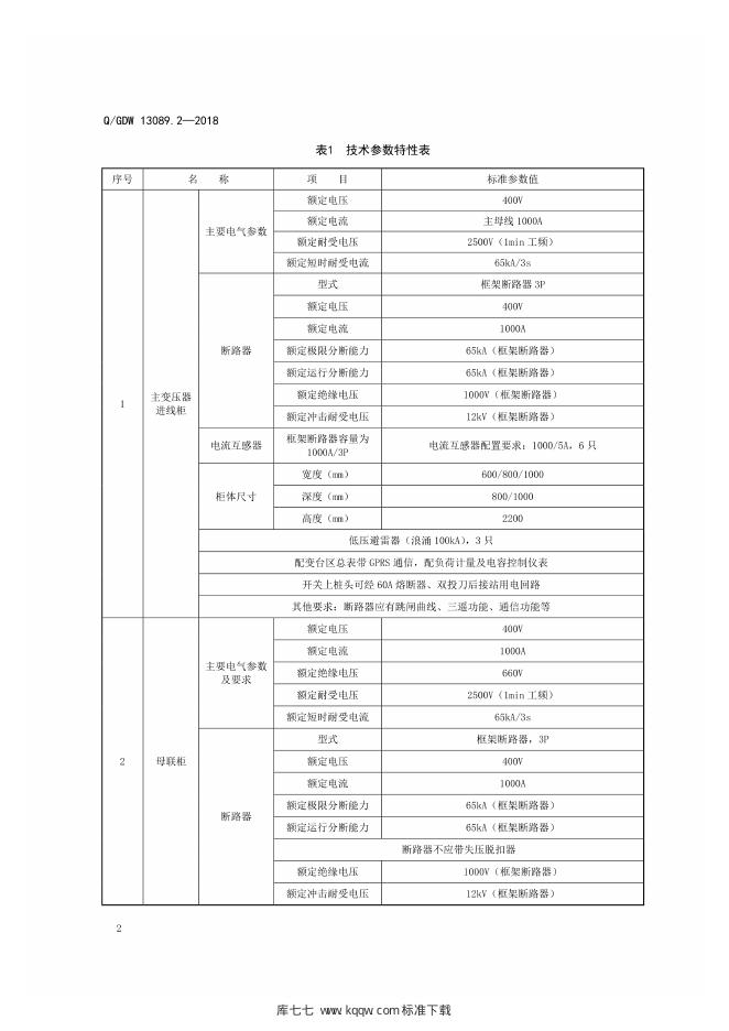Q/GDW 13089.2-2018 低压开关柜采购标准 第2部分:400V开关柜 1000A 专用技术规范