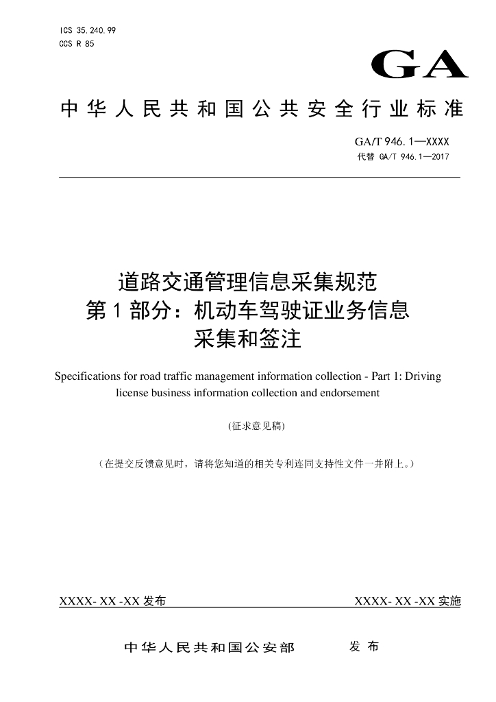 GA/T 946.1-XXXX 道路交通管理信息采集规范 第1部分:机动车驾驶证业务信息采集和签注(征求意见稿)
