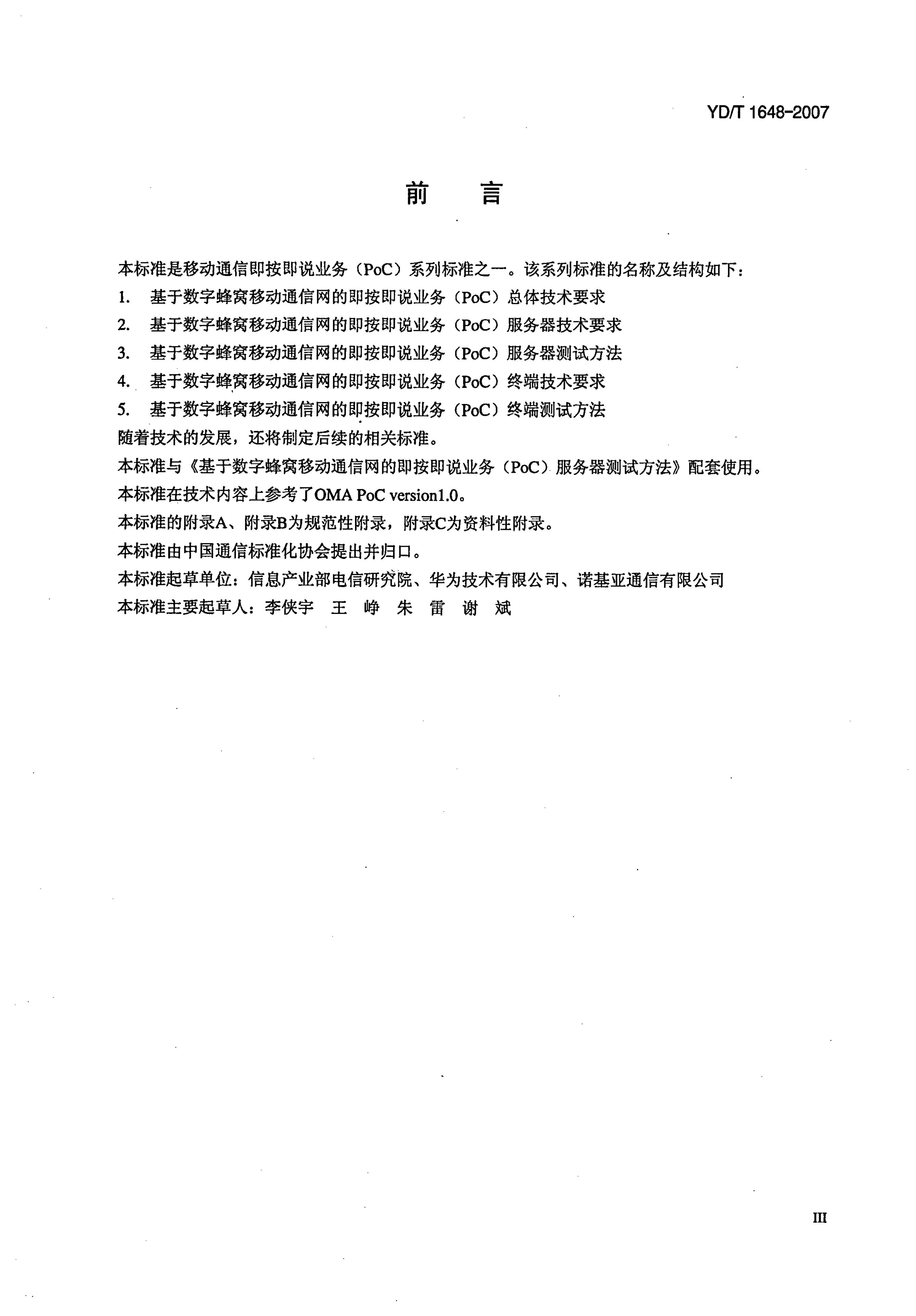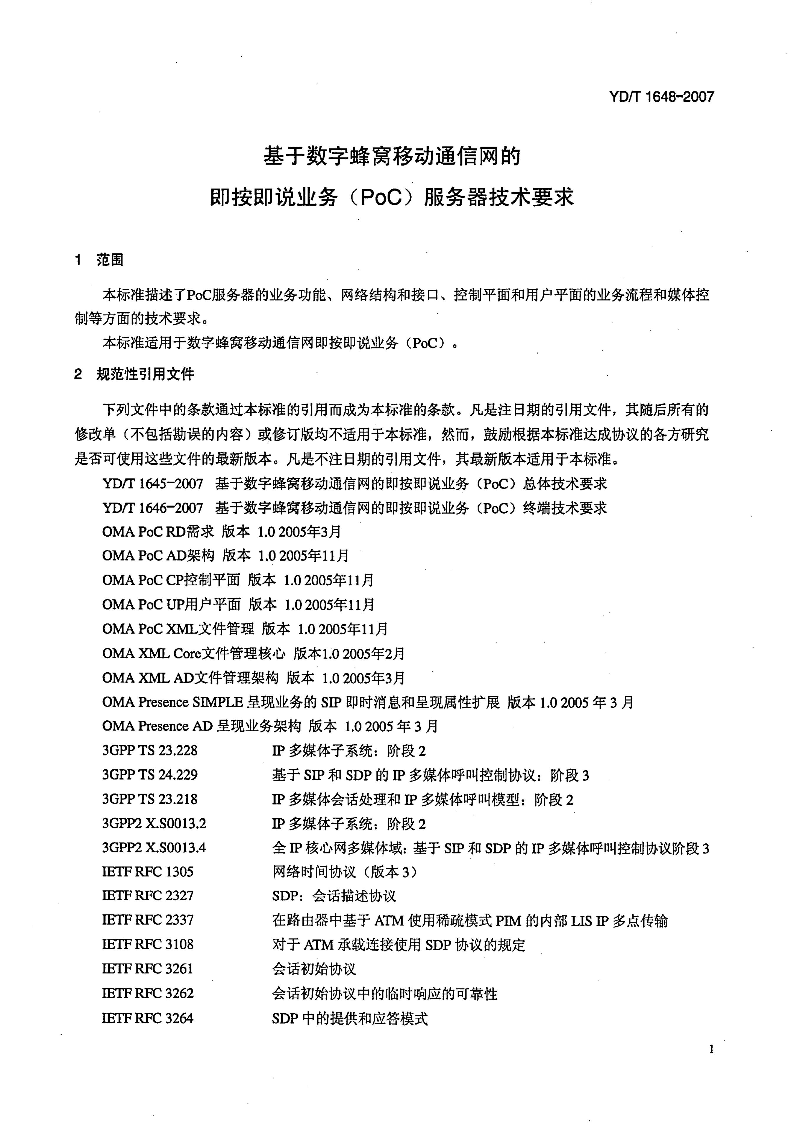 YD/T 1648-2007 基于数字蜂窝移动通信网的即按即说业务(PoC)服务器技术要求