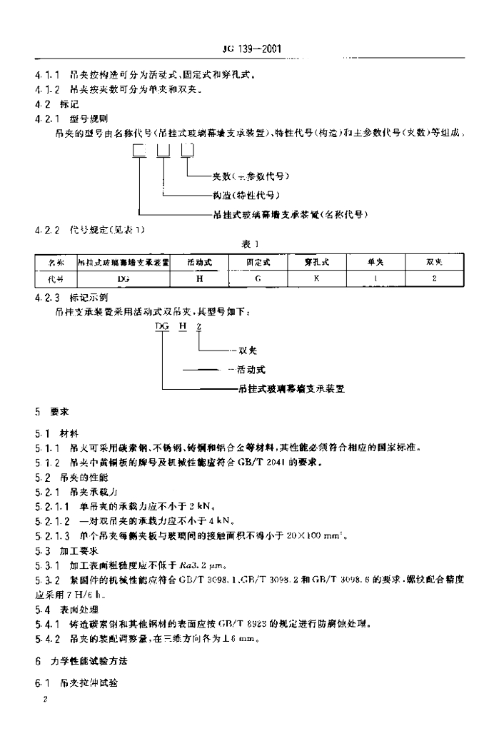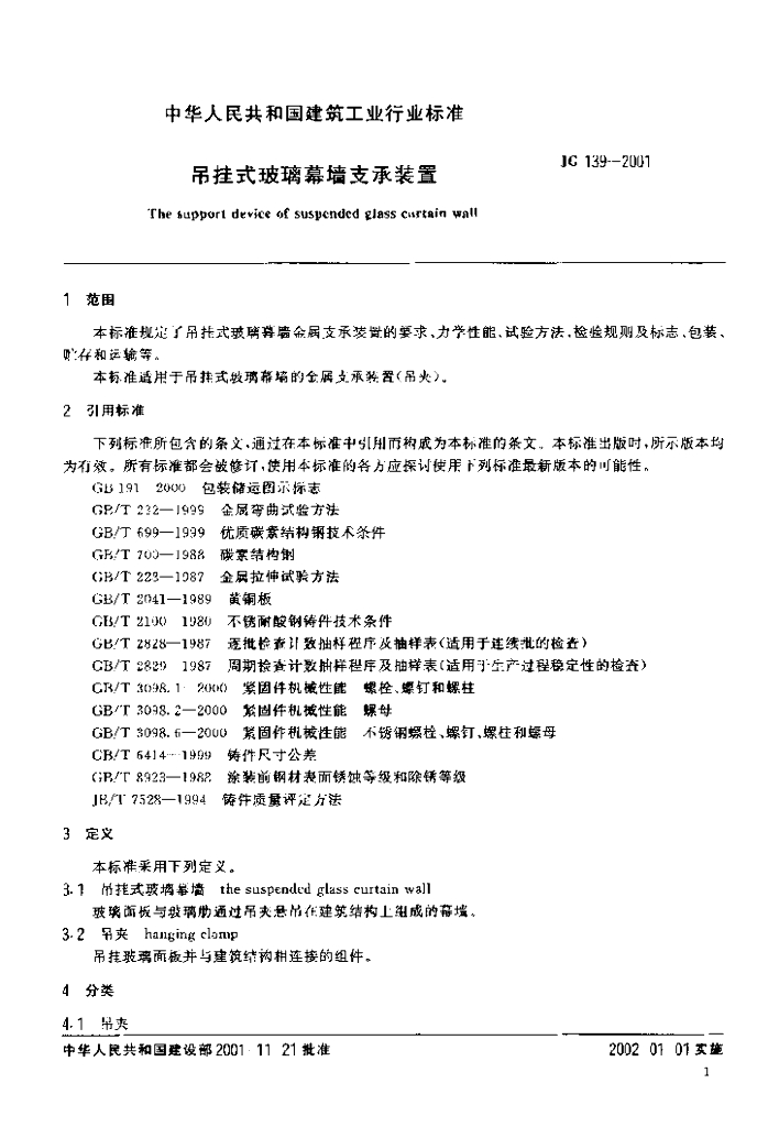 JG 139-2001 吊挂式玻璃幕墙支承装置