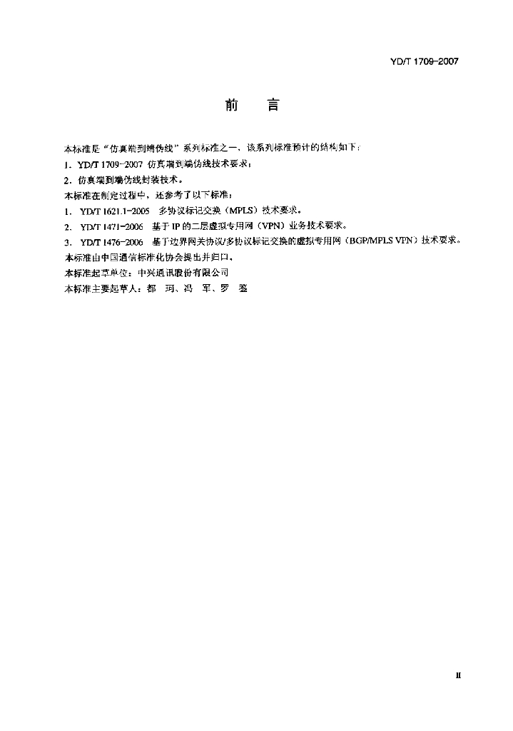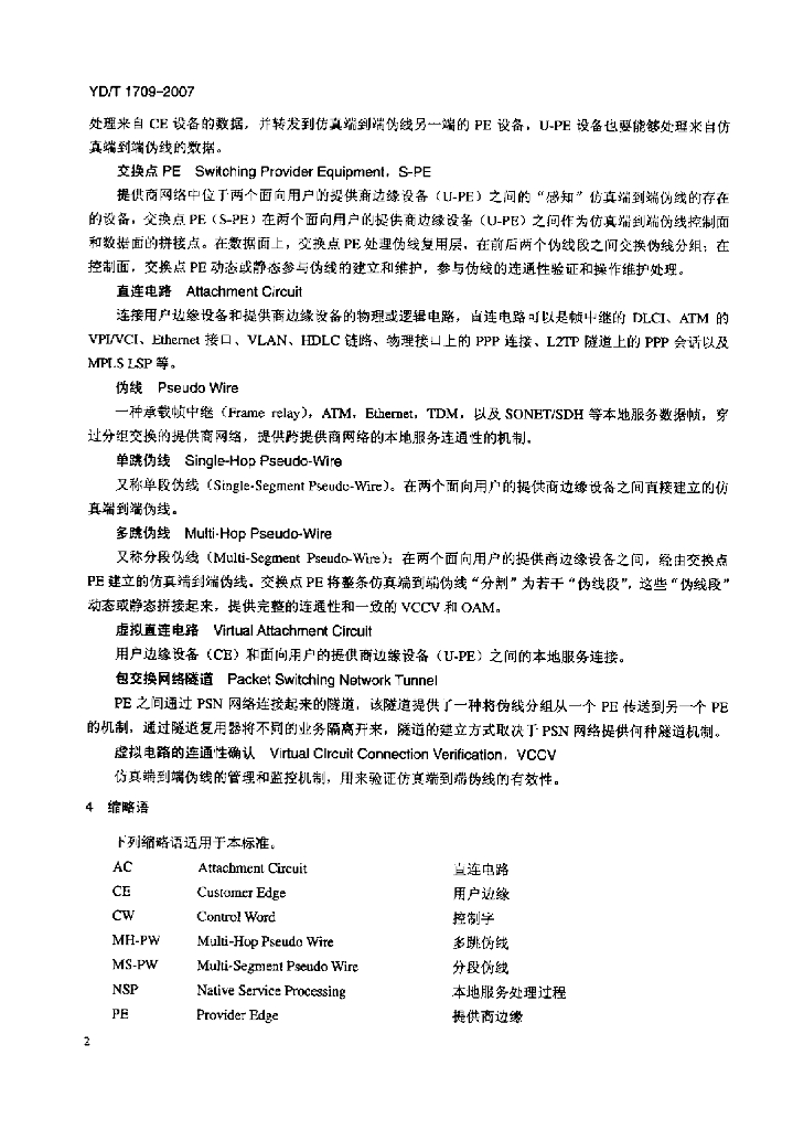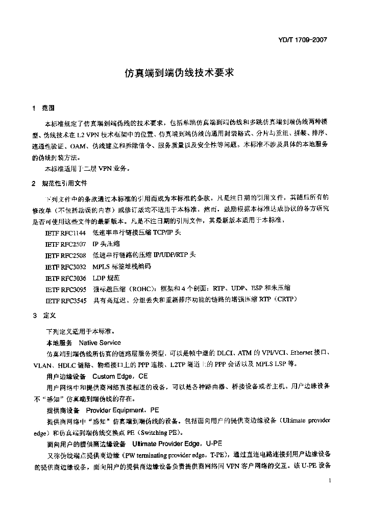 YD/T 1709-2007 仿真端到端伪线技术要求