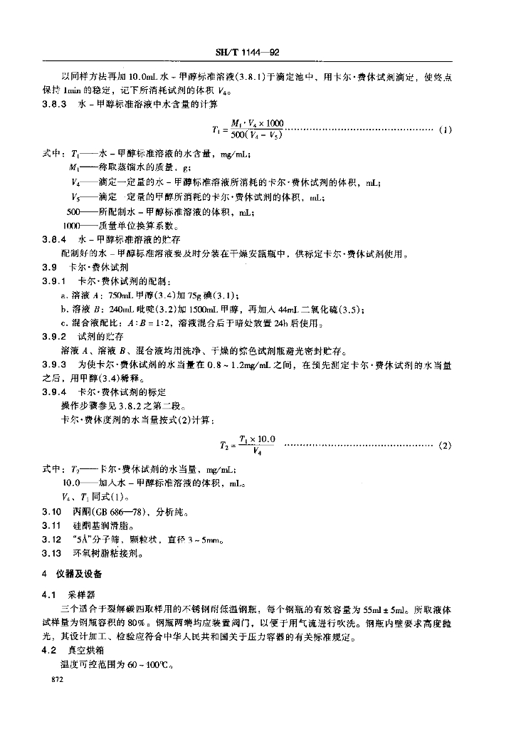 SH/T 1144-1992 工业用裂散碳四中微量水的测定 卡尔费休法