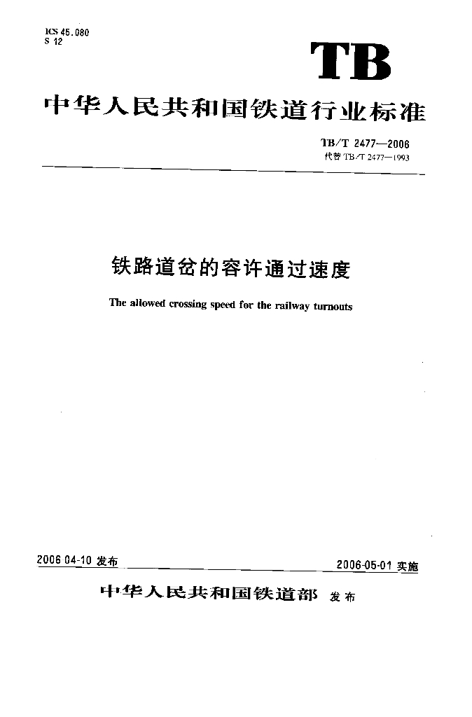 TB/T 2477-2006 铁路道岔的容许通过速度