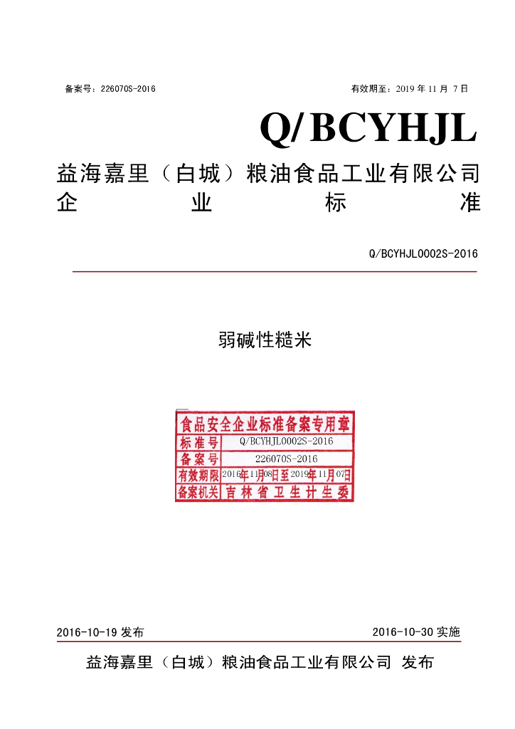 Q/BCYHJL 0002S-2016 益海嘉里(白城)粮油食品工业有限公司 弱碱性糙米