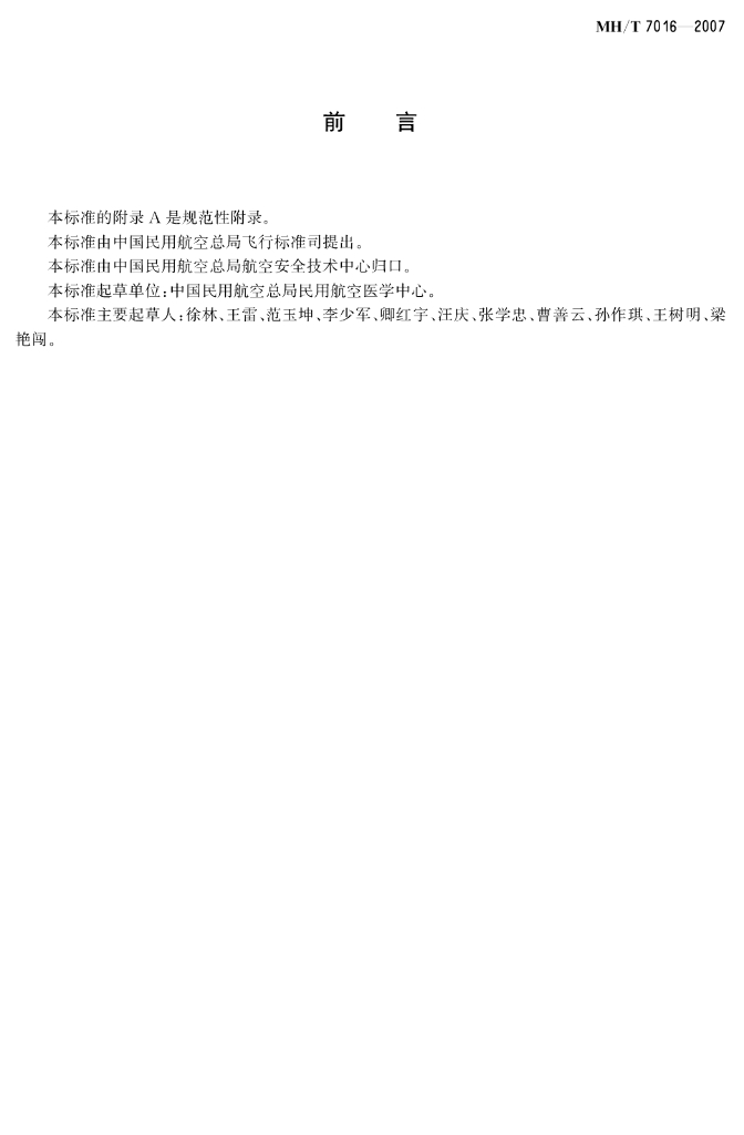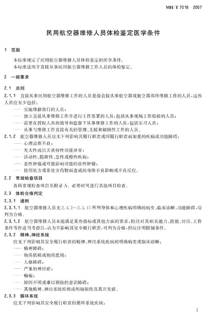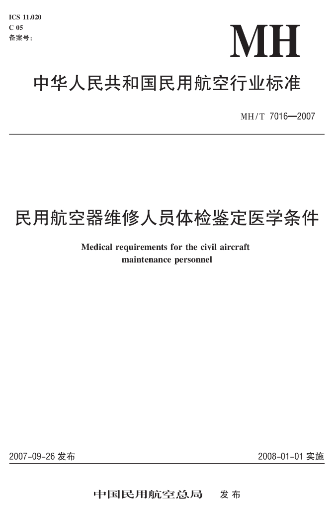 MH/T 7016-2007 民用航空器维修人员体检鉴定医学条件