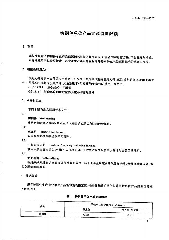 DB31/ 638-2020 铸钢件单位产品能源消耗限额