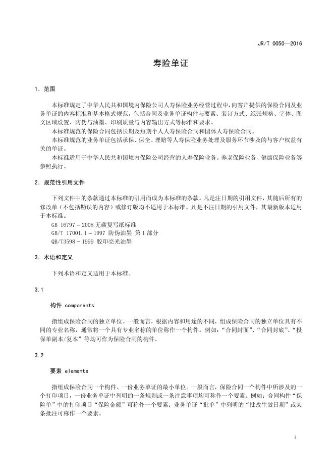 JR/T 0050-2016 寿险单证
