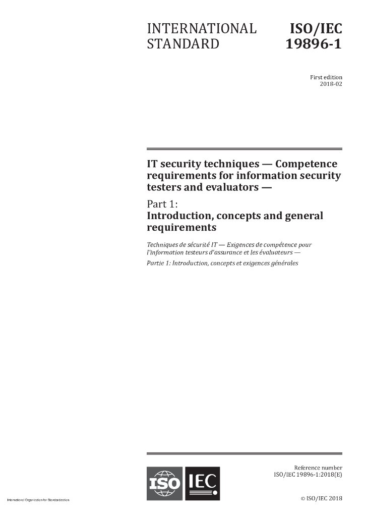 ISO/IEC 19896-1-2018 IT安全技术 信息安全测试人员和评估人员的能力要求 第1部分 介绍、概念和基本要求