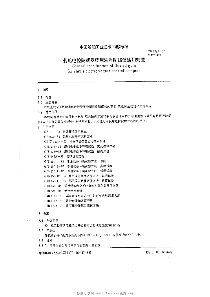CB 1323-1997 舰船电控陀螺罗经用液浮陀螺仪通用规范