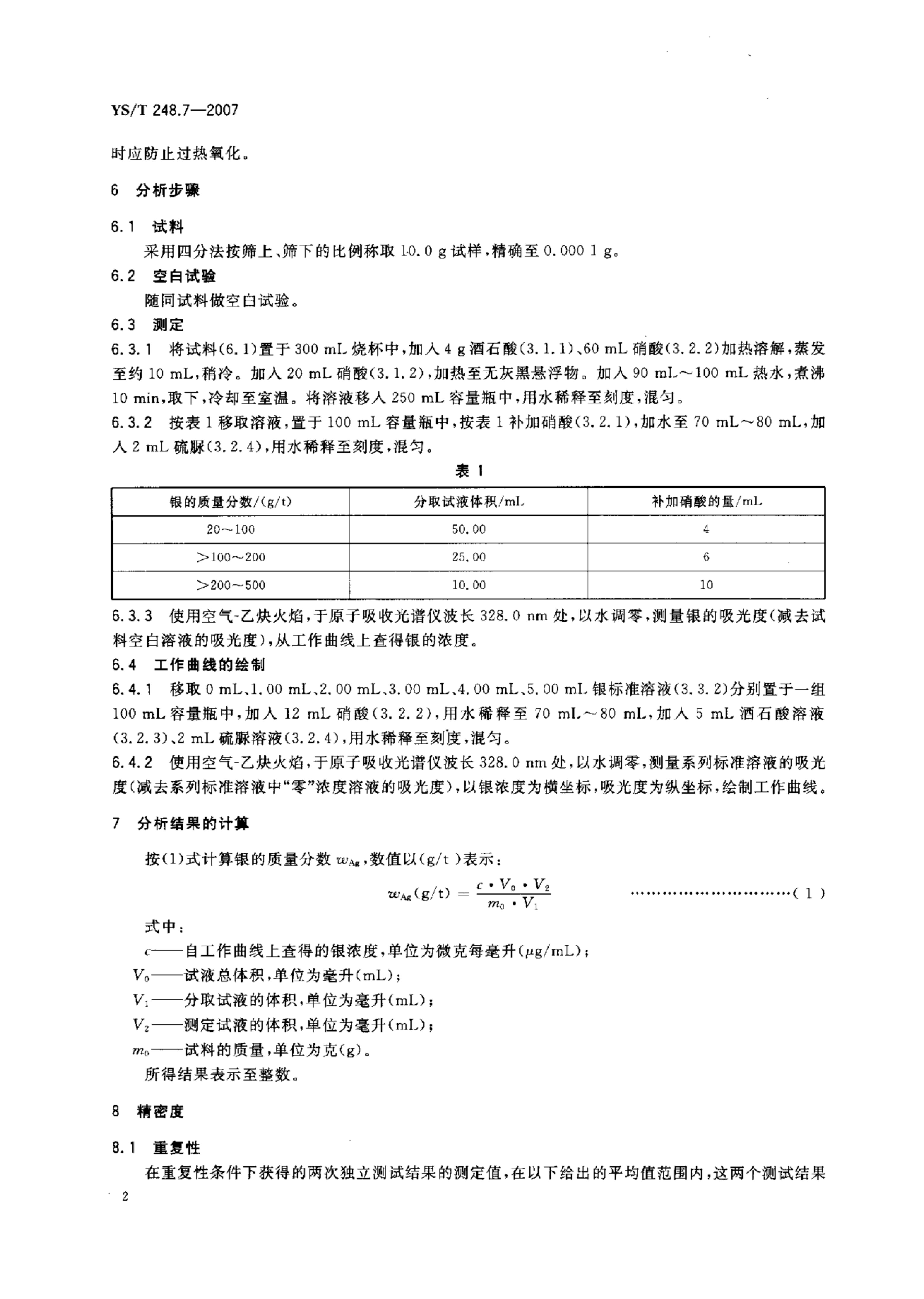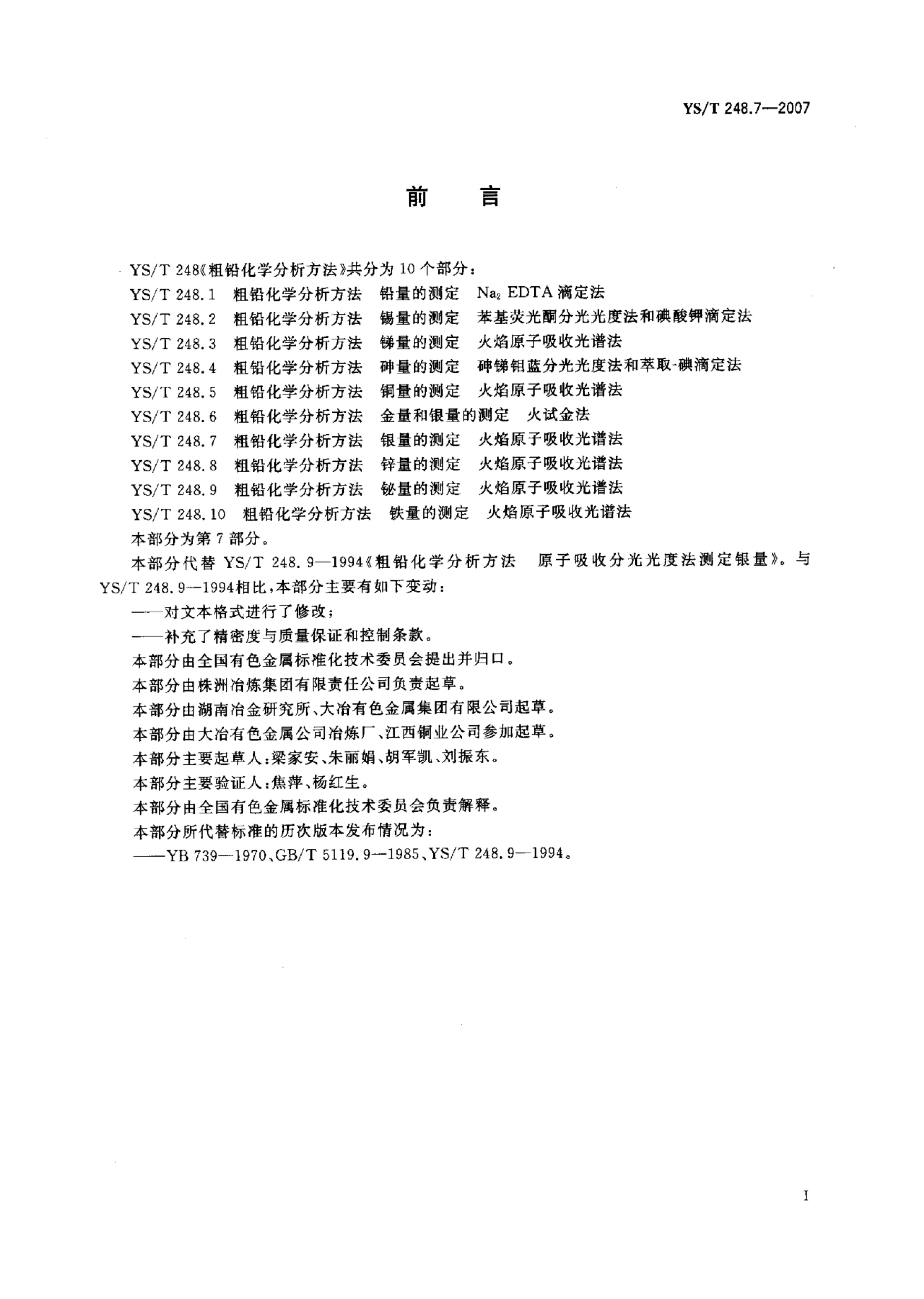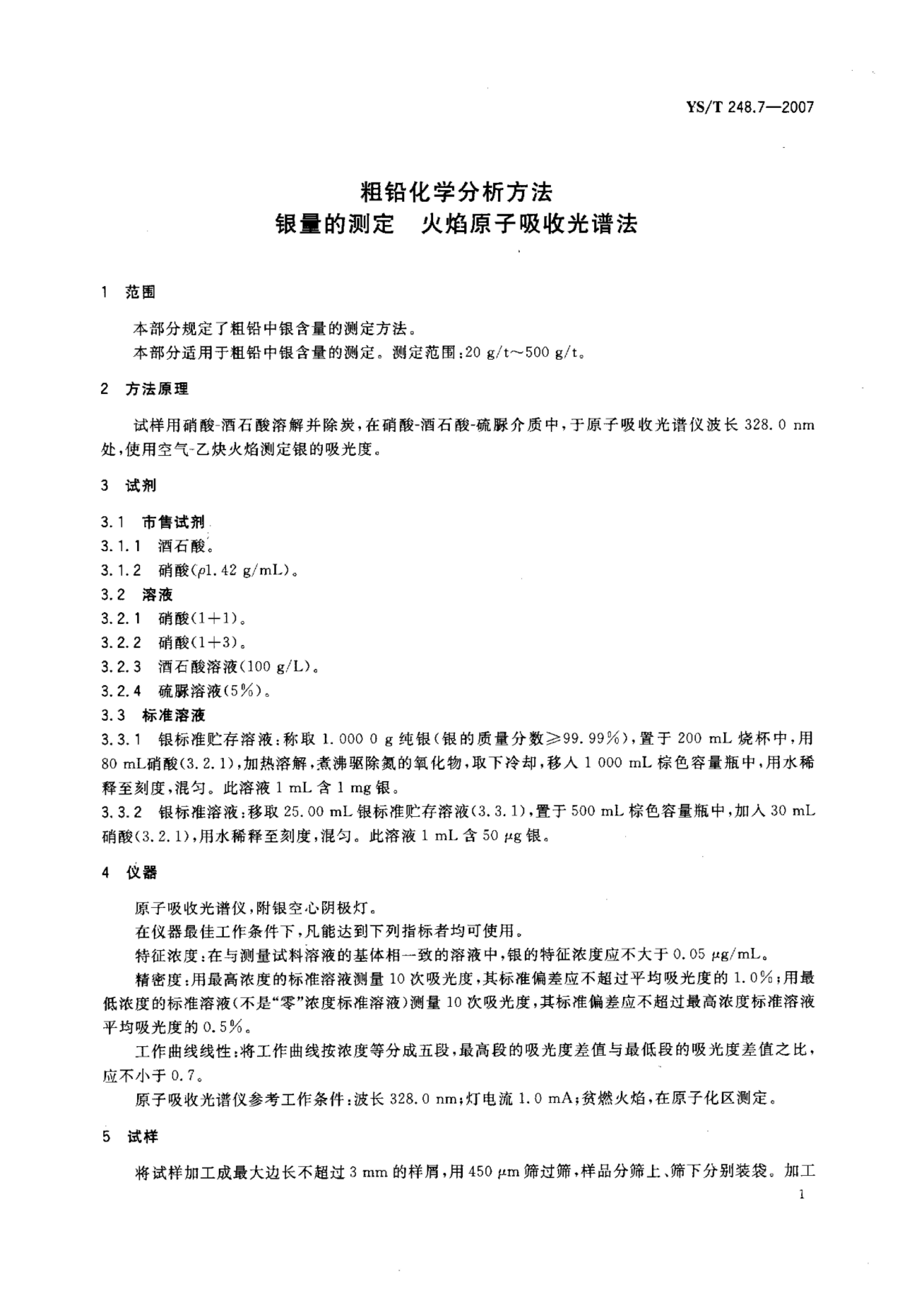 YS/T 248.7-2007 粗铅化学分析方法银量的测定火焰原子吸收光谱法