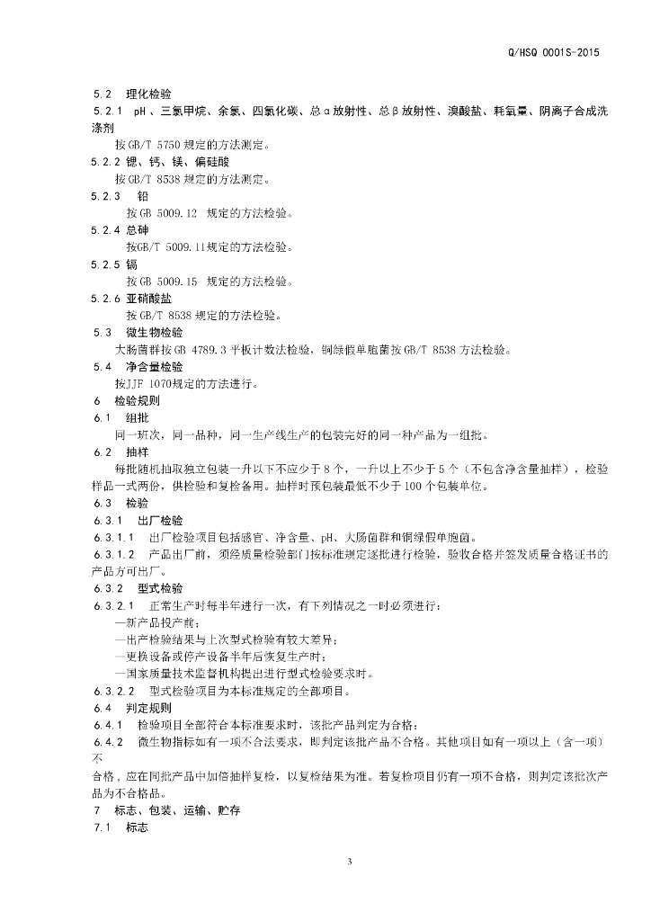 Q/HSQ 0001S-2015 济南涵思泉水业有限公司 瓶(桶)装涵思泉弱碱性天然泉水