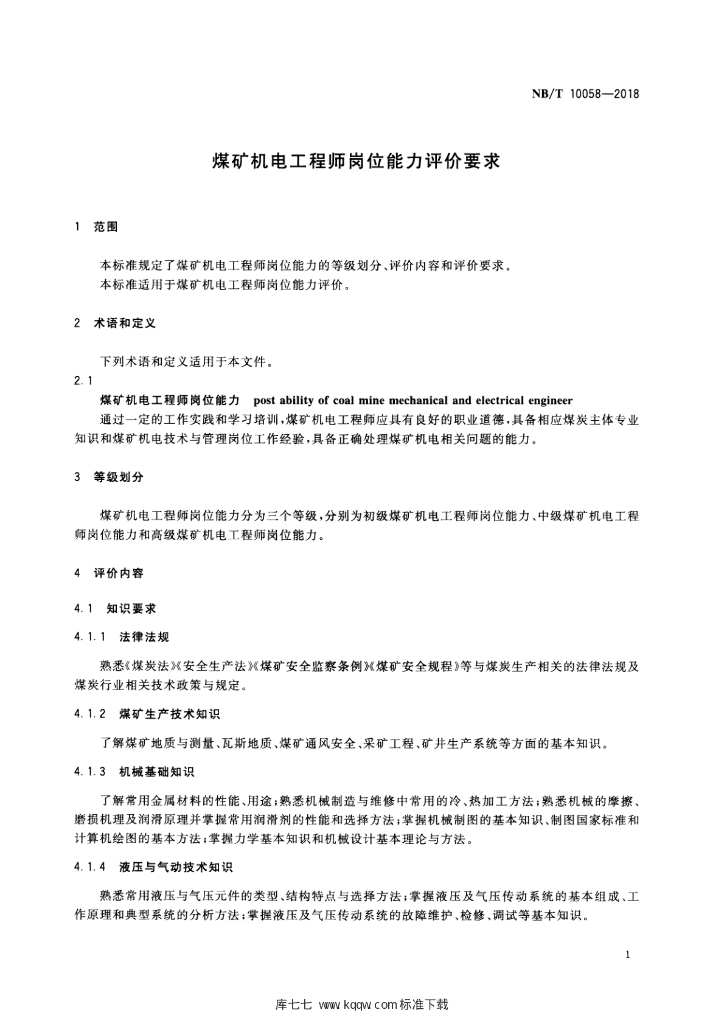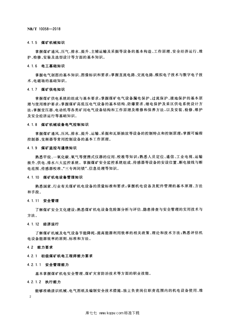 NB/T 10058-2018 煤矿机电工程师岗位能力评价要求