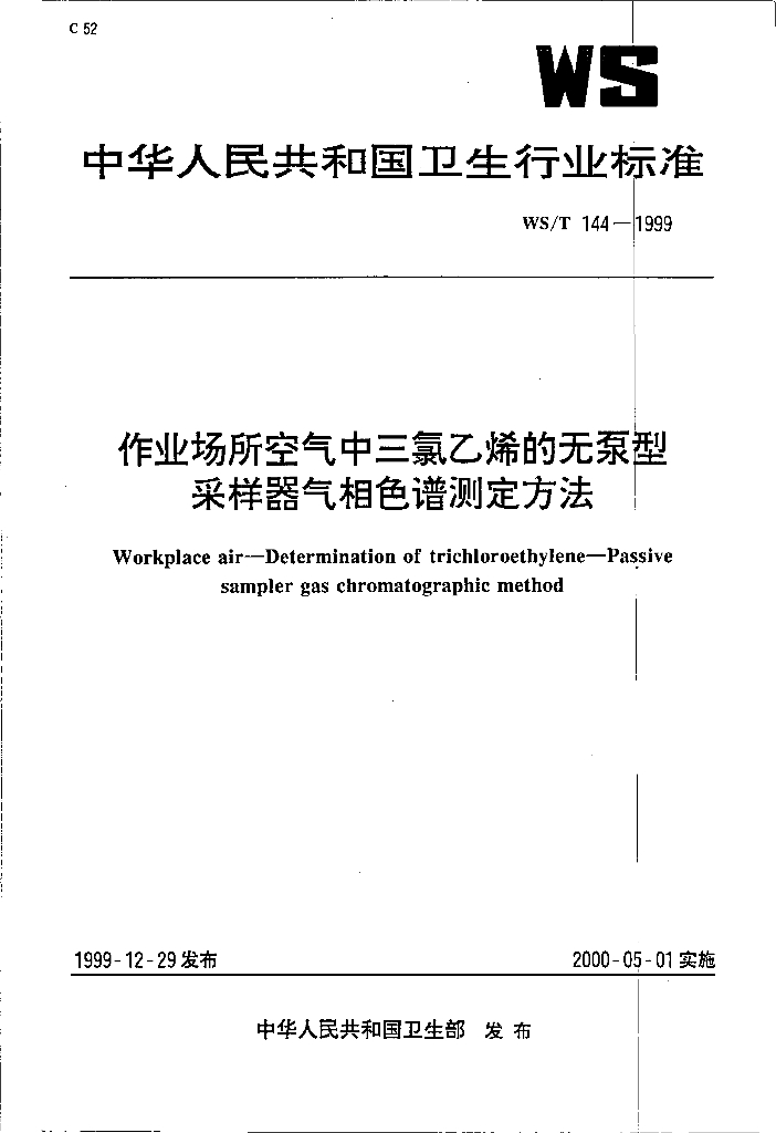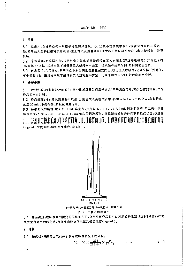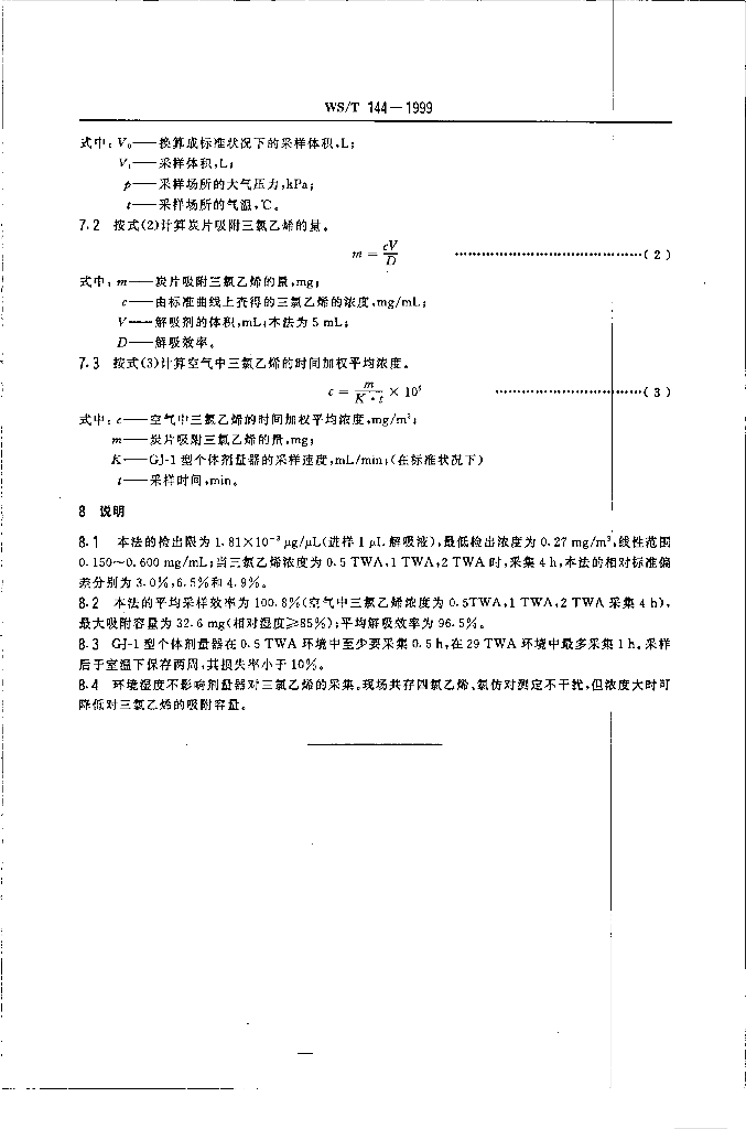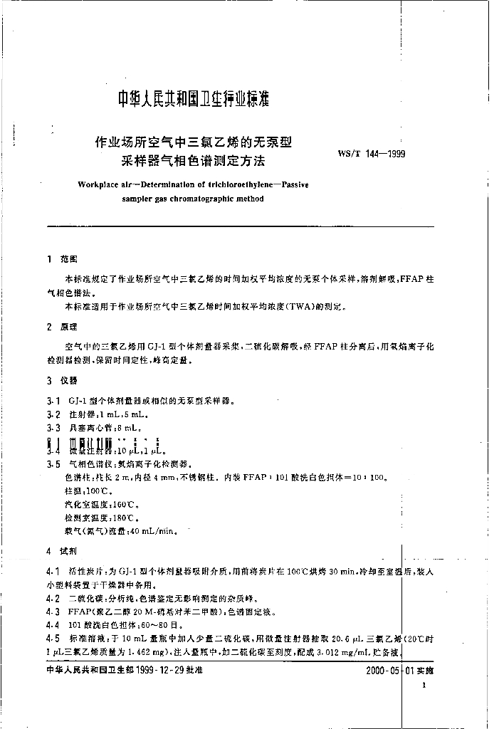 WS/T 144-1999 作业场所空气中三氯乙烯无泵采样器气相色谱测定方法