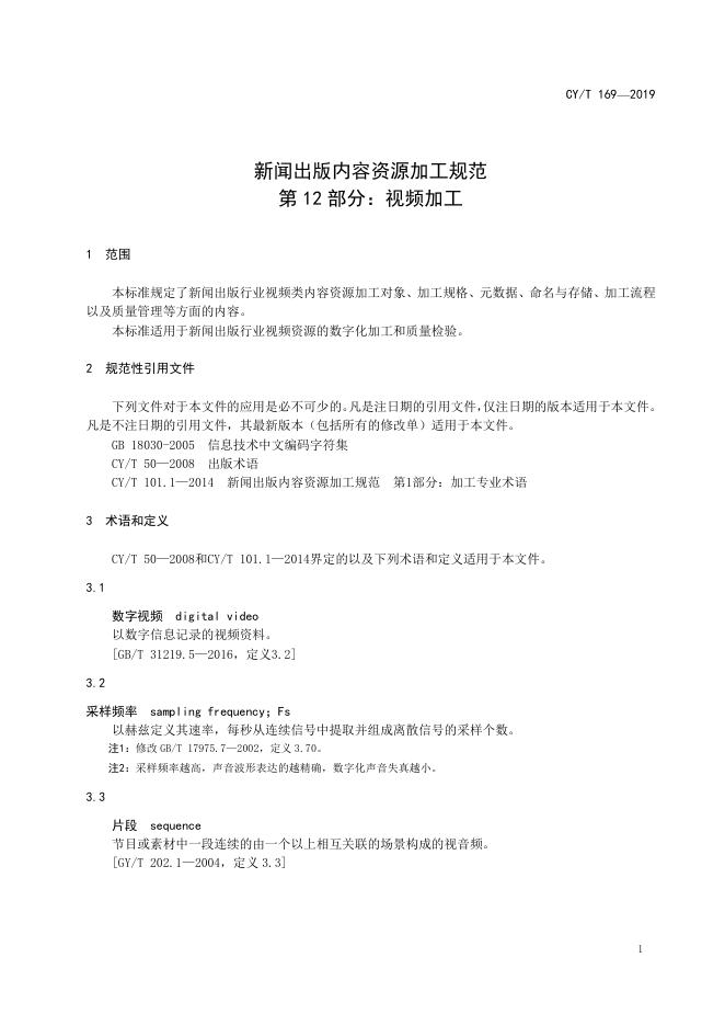 CY/T 169-2019 新闻出版内容资源加工规范 第12部分:视频加工