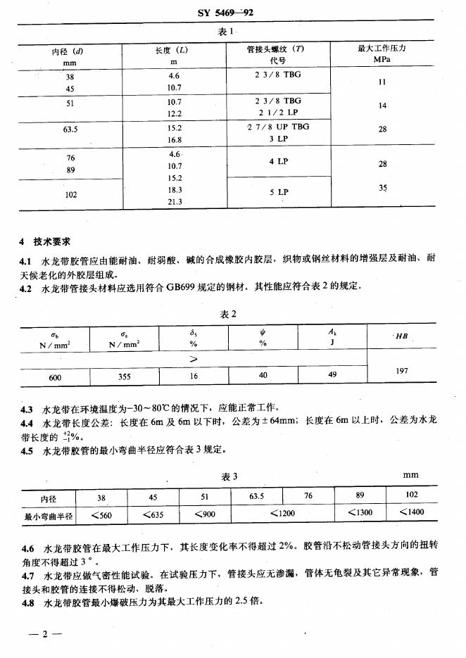 SY 5469-1992 旋转钻井设备 水龙带(国标清理整顿后转为行标)