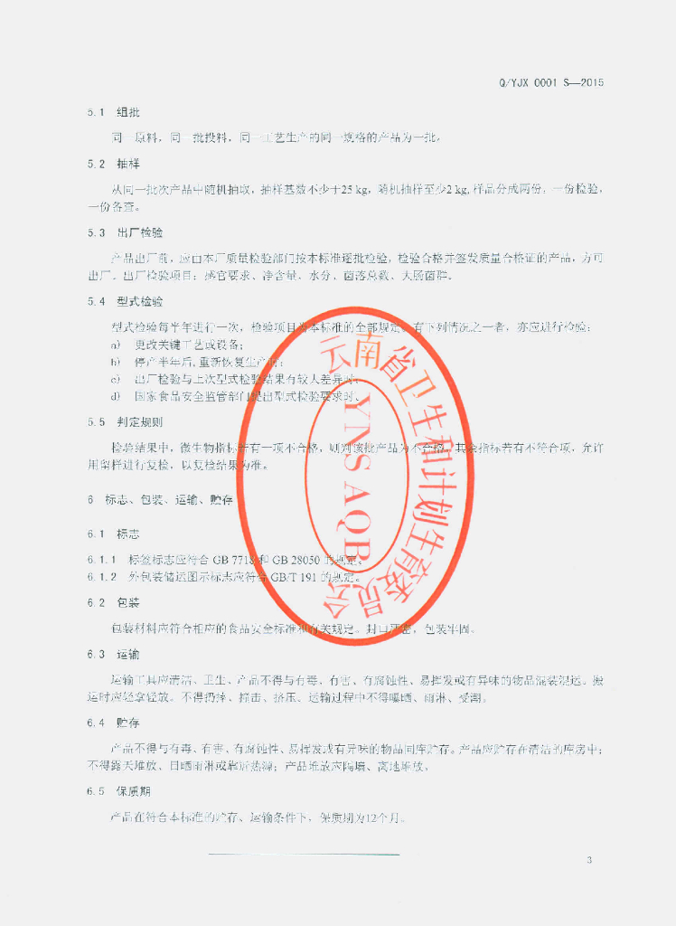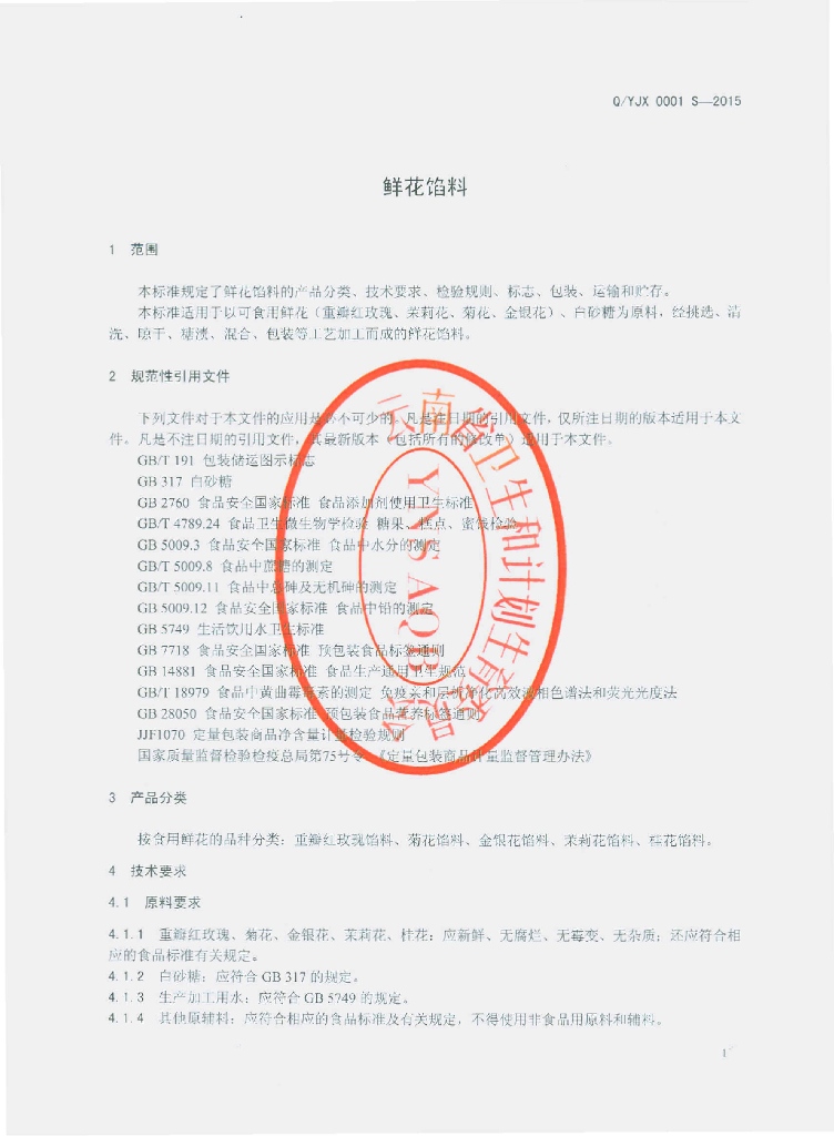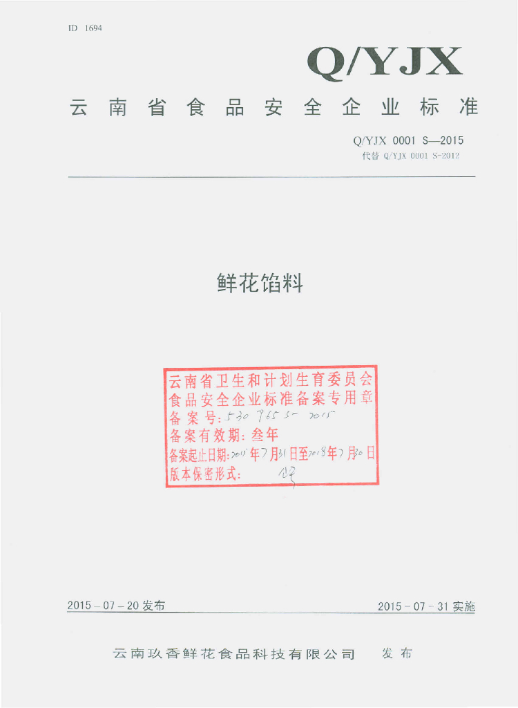 Q/YJX 0001S-2015 云南玖香鲜花食品科技有限公司 鲜花馅料