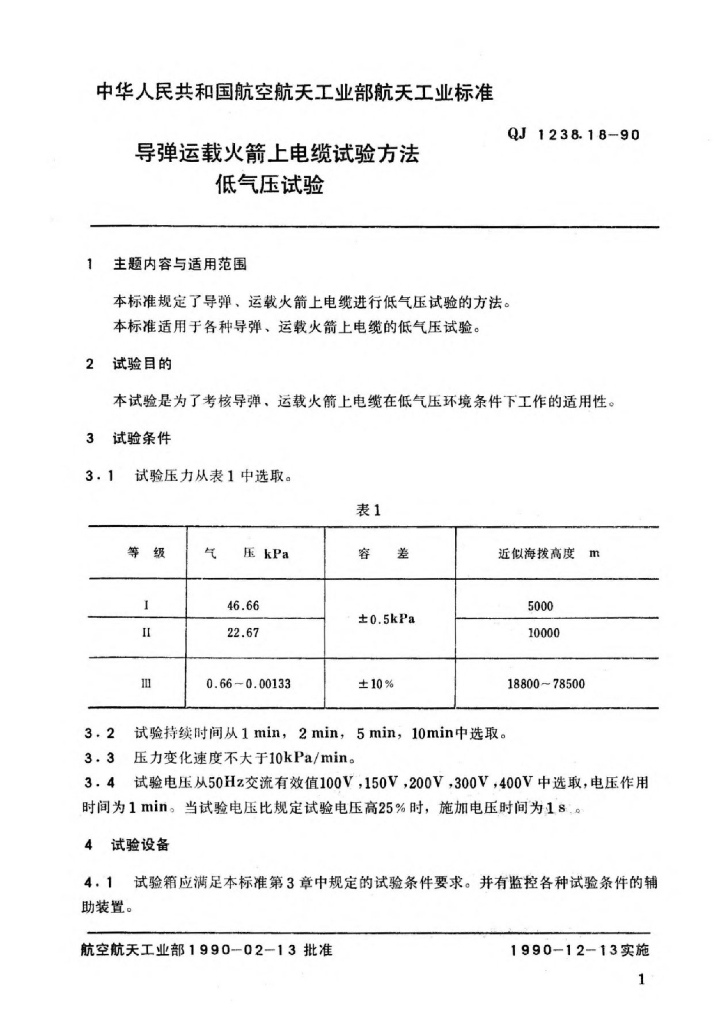 QJ 1238.18-1990 导弹运载火箭上电缆试验方法 低气压试验