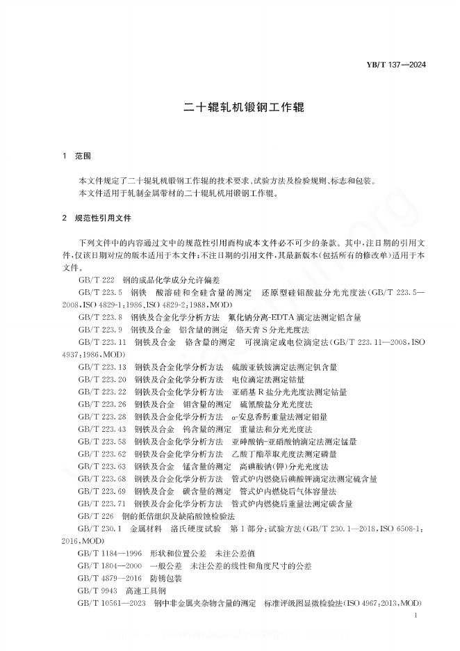 YB/T 137-2024 二十辊轧机锻钢工作辊