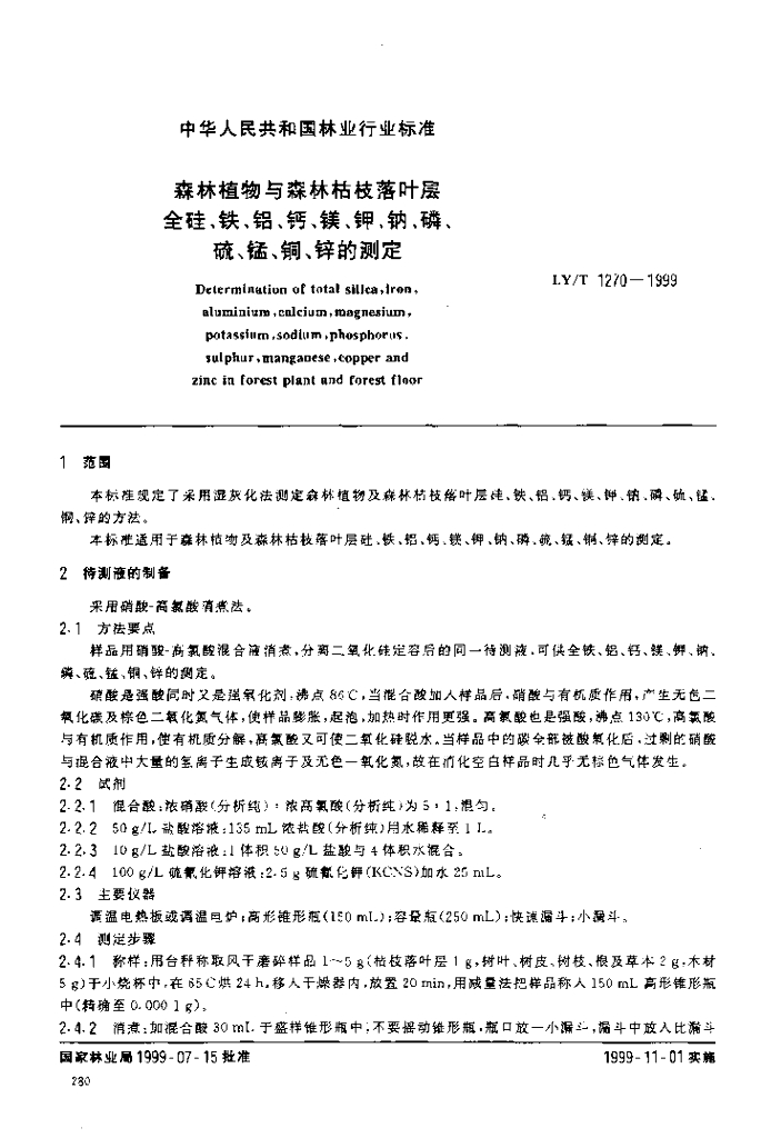 LY/T 1270-1999 森林植物与森林枯枝落叶层全硅、铁、铝、钙、镁、钾、钠、磷、硫、锰、铜、锌的测定