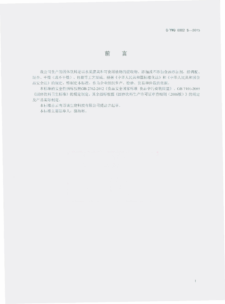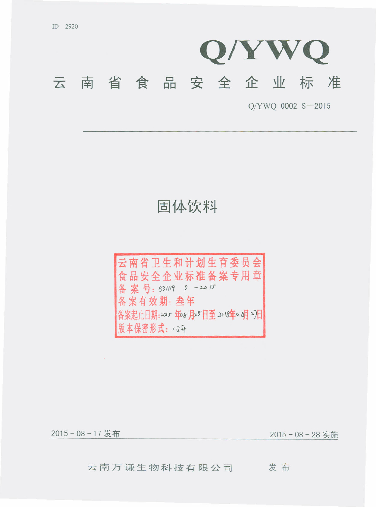 Q/YWQ 0002S-2015 云南万谦生物科技有限公司 固体饮料