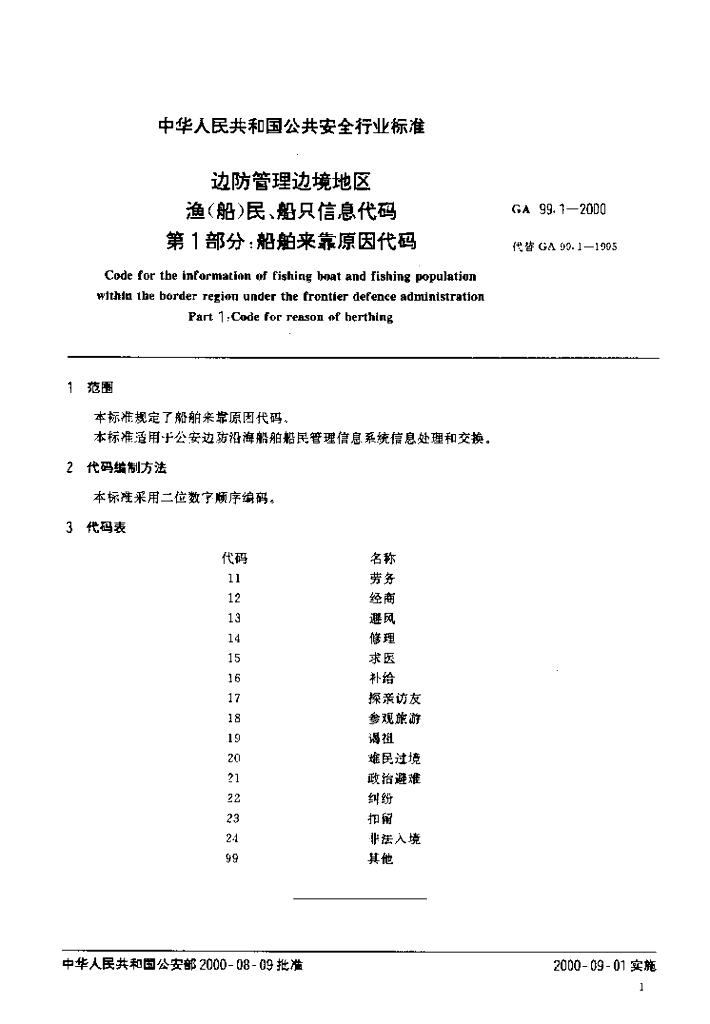 GA 99.1-2000 边防管理边境地区 渔(船)民、船只信息代码 第1部分 船舶来靠原因代码
