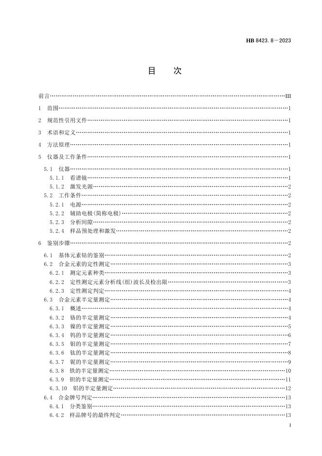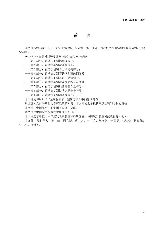 HB 8423.8-2023 金属材料牌号鉴别方法 第8部分:看谱法鉴别钴基高温合金牌号