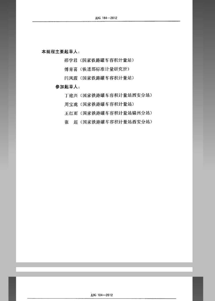 邵学君(国家铁路罐车容积计量站) 、傅青喜(铁道部标准计量研究所)、闫凤霞(国家铁路罐车容积计量站)、丁建兴(国家铁路罐车容积计量站西安分站)、周宝珑(国家铁路罐车容积计量站)、王红雨(国家铁路罐车容积计量站锦州分站)、张超(国家铁路罐车容积计量站西安分站)