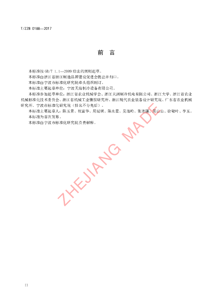 本标准由宁波市标准化研究院牵头组织制订。、本标准主要起草单位:宁波天海制冷设备有限公司。、本标准参加起草单位:浙江省农业机械学会、浙江天洲制冷机电有限公司、浙江大学、浙江省农业机械标准化技术委员会、浙江省机械工业情报研究所、浙江现代农业装备设计研究院、广东省农业机械研究所、宁波市标准化研究院(排名不分先后)。