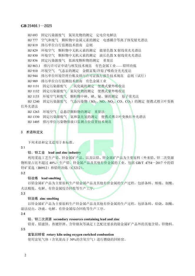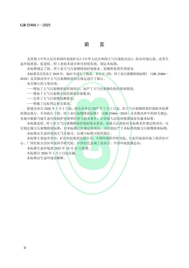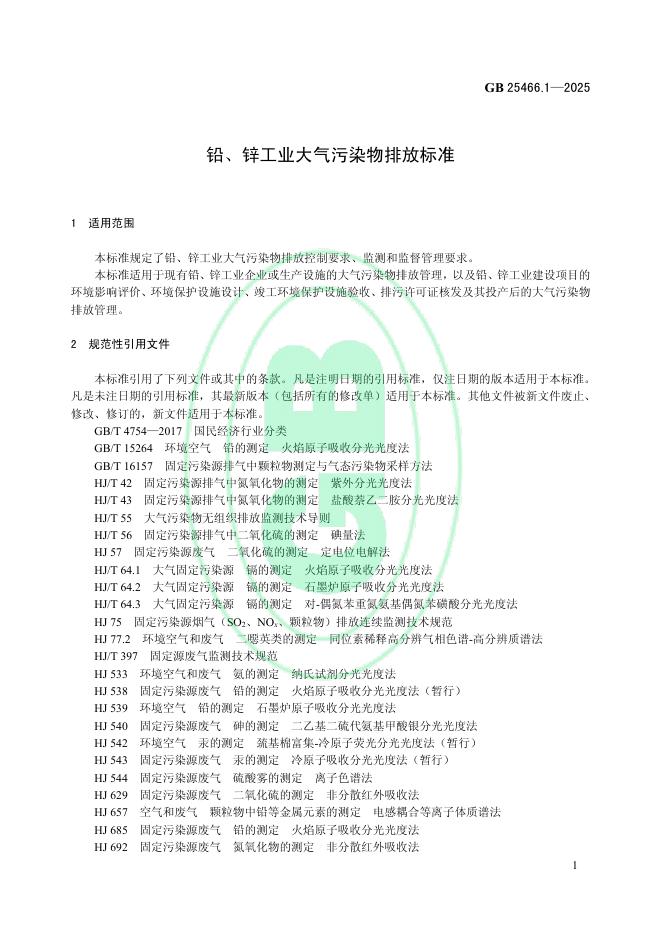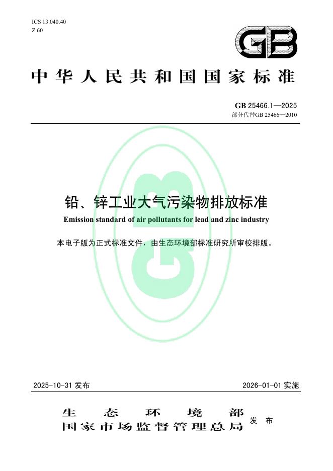 GB 25466.1-2025 铅、锌工业大气污染物排放标准
