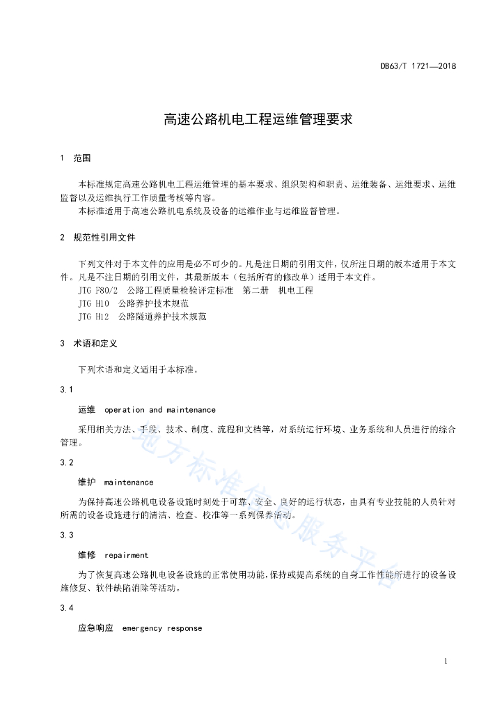 DB63/T 1721-2018 高速公路机电工程运维管理要求
