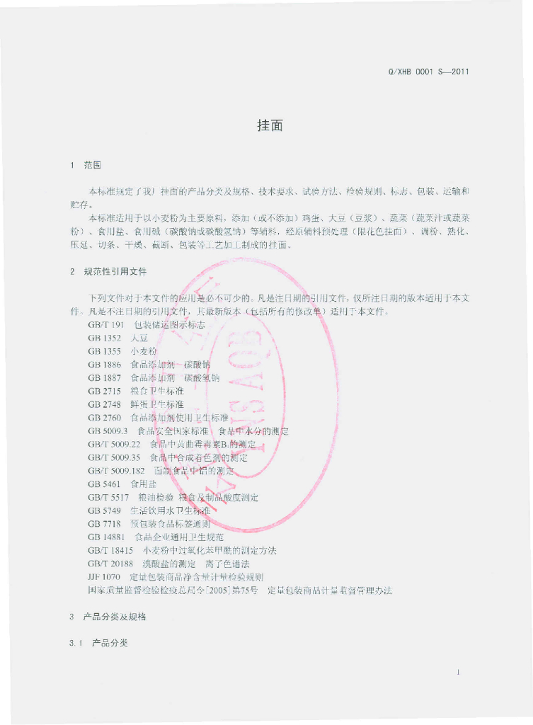 Q/XHB 0001S-2011 挂面