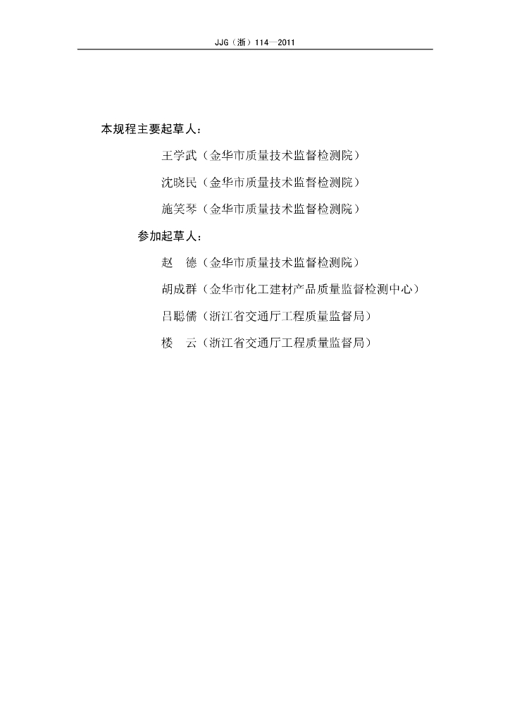 王学武(金华市质量技术监督检测院)、沈晓民(金华市质量技术监督检测院)、施笑琴(金华市质量技术监督检测院)、赵德(金华市质量技术监督检测院)、胡成群(金华市化工建材产品质量监督检测中心)、吕聪儒(浙江省交通厅工程质量监督局)、楼云(浙江省交通厅工程质量监督局)