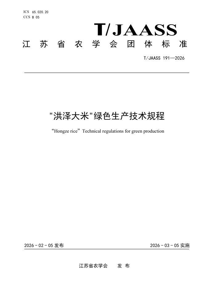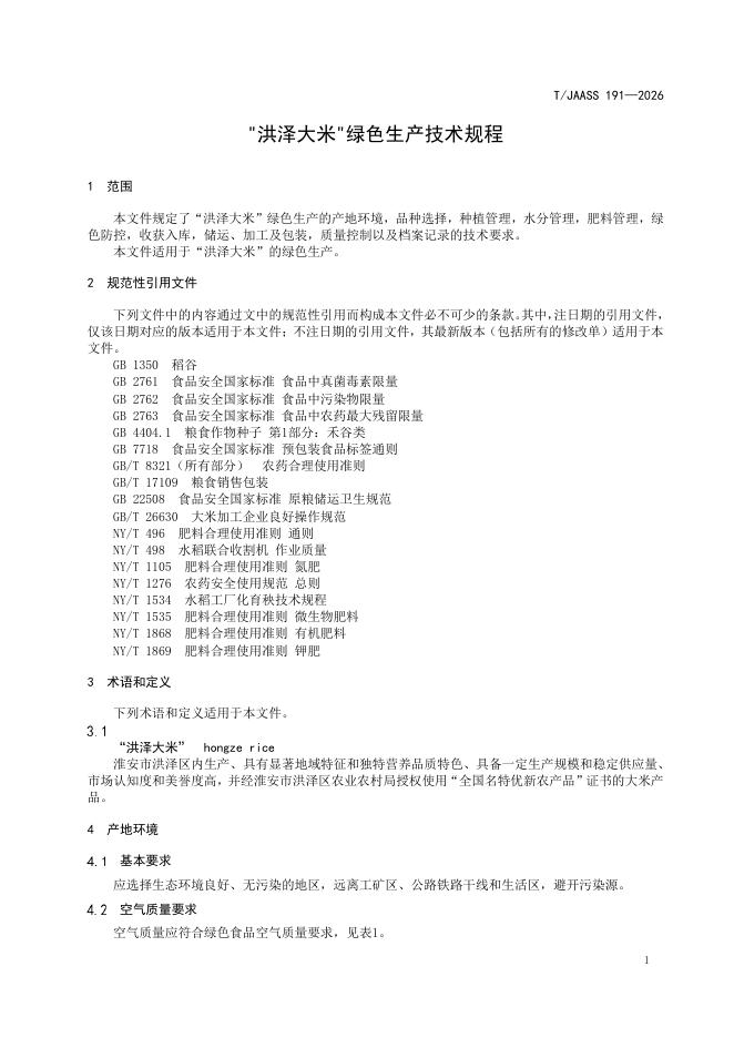 T/JAASS 191-2026 “洪泽大米“绿色生产技术规程