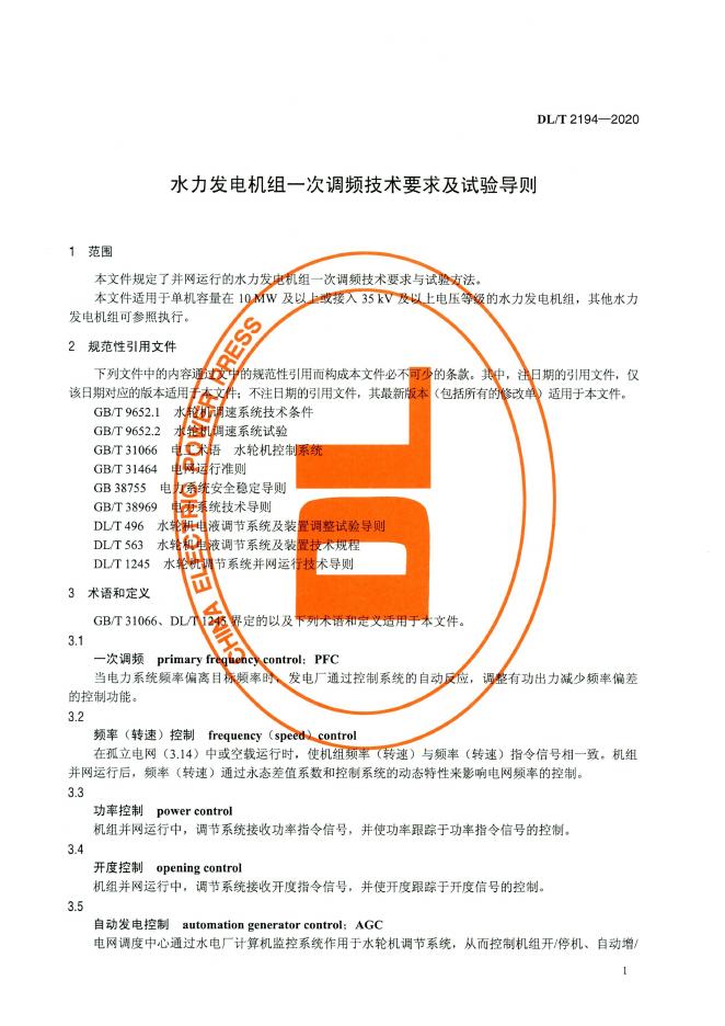 DL/T 2194-2020 水力发电机组一次调频技术要求及试验导则