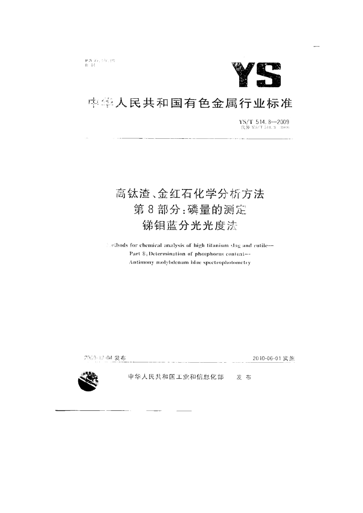 YS/T 514.8-2009 高钛渣、金红石化学分析方法 第8部分:磷量的测定 锑钼蓝分光光度法