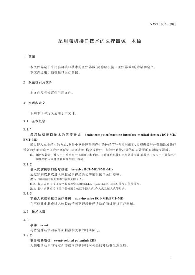 YY/T 1987-2025 采用脑机接口技术的医疗器械 术语