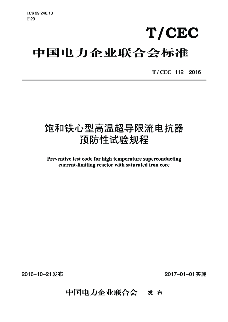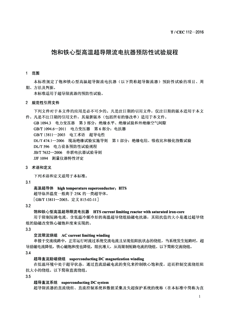 T/CEC 112-2016 饱和铁心型高温超导限流电抗器预防性试验规程