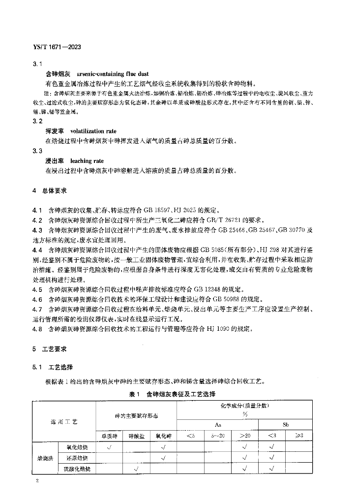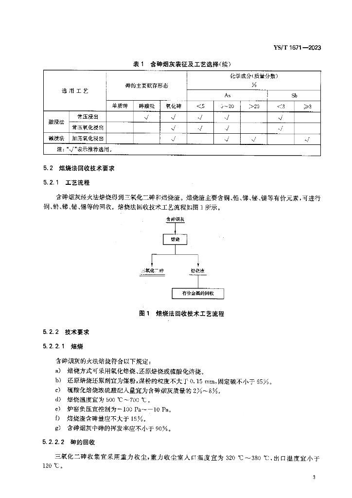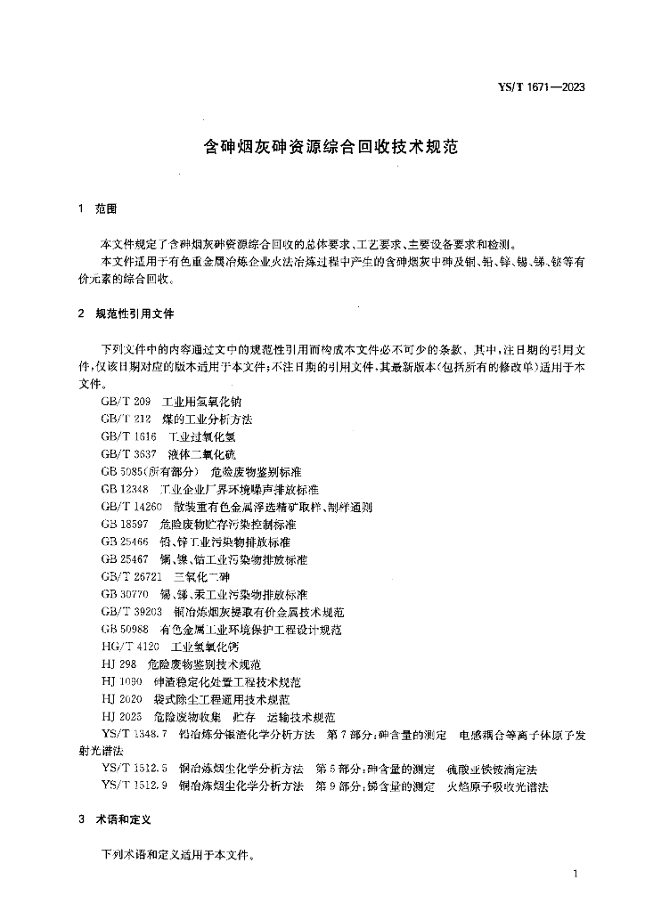 YS/T 1671-2023 含砷烟灰砷资源综合回收技术规范