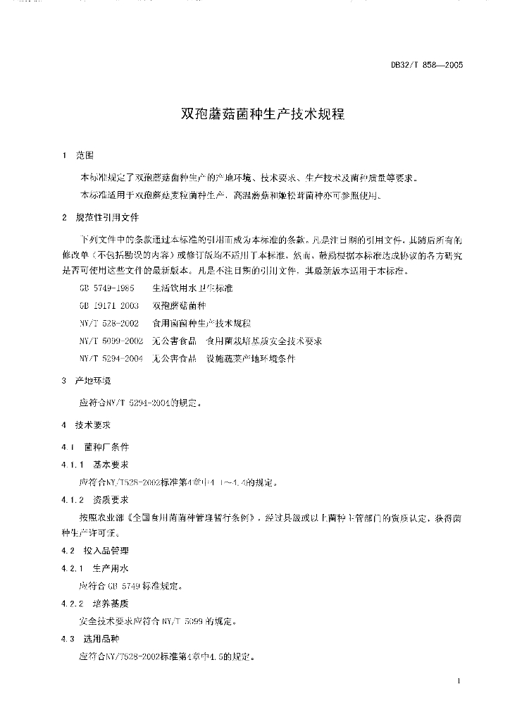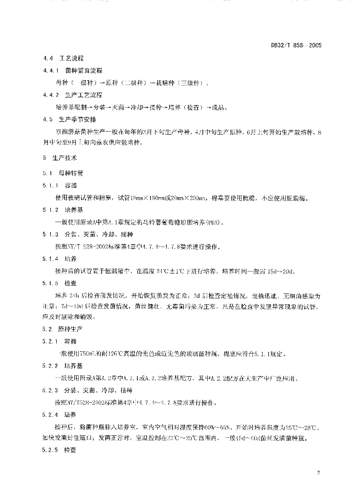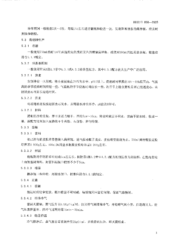 DB32/T 858-2005 双孢蘑菇菌种生产技术规程
