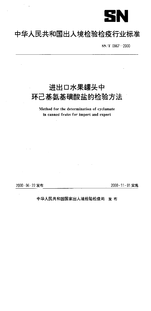 SN/T 0867-2000 进出口水果罐头中环己基氨基磺酸盐的检验方法